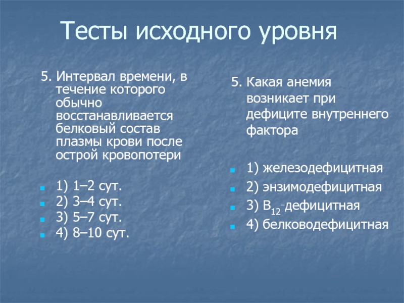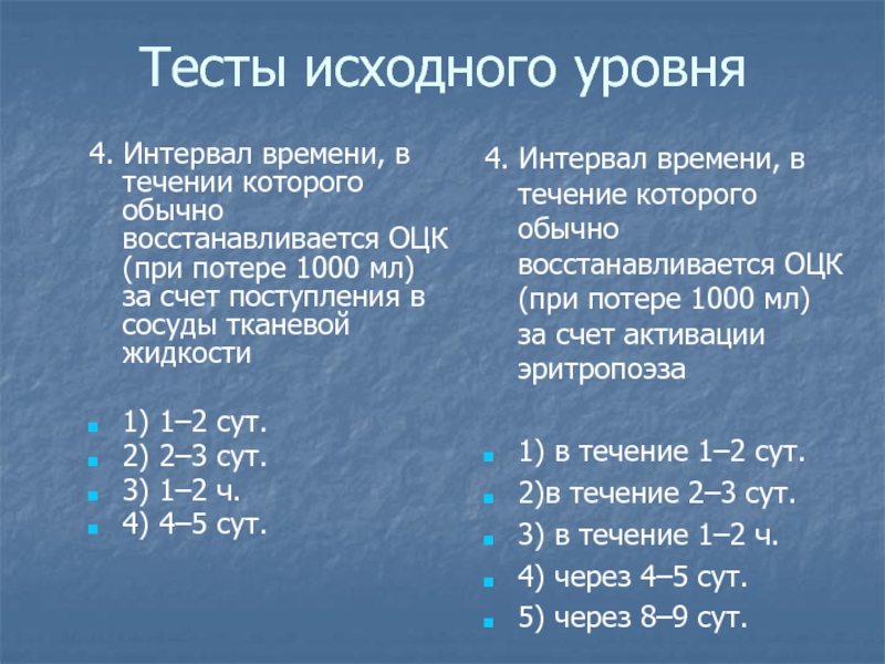 4. Интервал времени, в течение которого обычно восстанавливается ОЦК (при потере 1000 мл) за счет активации эритропоэза
