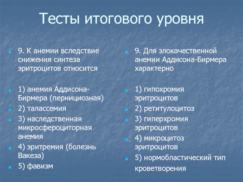 9. К анемии вследствие снижения синтеза эритроцитов относится