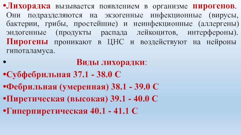 Слайд 6Лихорадка вызывается появлением в организме пирогенов. Они подразделяются на экзогенные