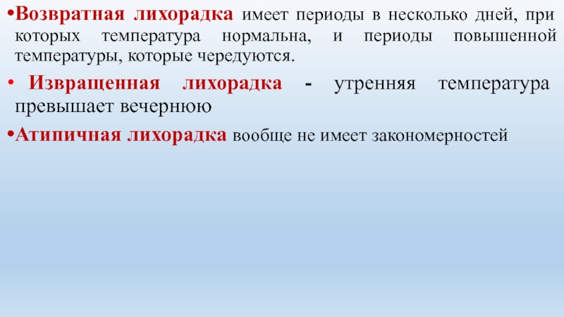 Слайд 8Возвратная лихорадка имеет периоды в несколько дней, при которых температура