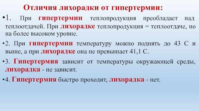 3. Гипертермия зависит от температуры окружающей среды, лихорадка - не зависит.