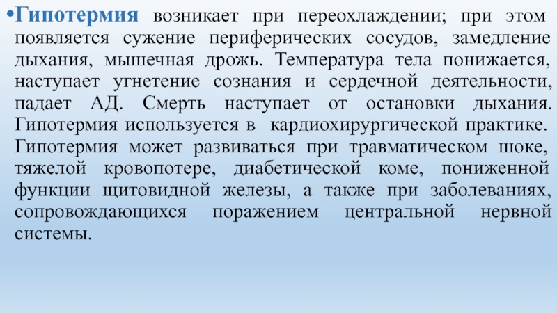 и сердечной деятельности, падает АД. Смерть наступает от остановки дыхания. Гипотермия используется в кардиохирургической практике. Гипотермия может развиваться при травматическом шоке, тяжелой кровопотере, диабетической коме, пониженной функции щитовидной железы, а также при заболеваниях, сопровождающихся поражением центральной нервной системы.