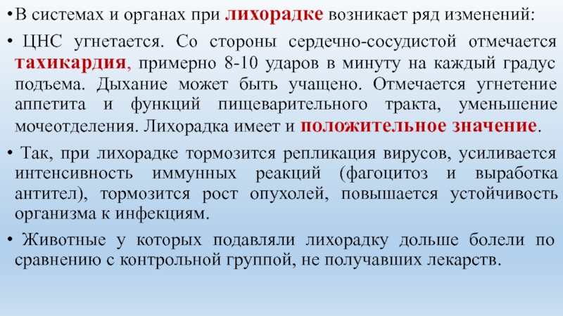 в минуту на каждый градус подъема. Дыхание может быть учащено. Отмечается угнетение аппетита и функций пищеварительного тракта, уменьшение мочеотделения. Лихорадка имеет и положительное значение.