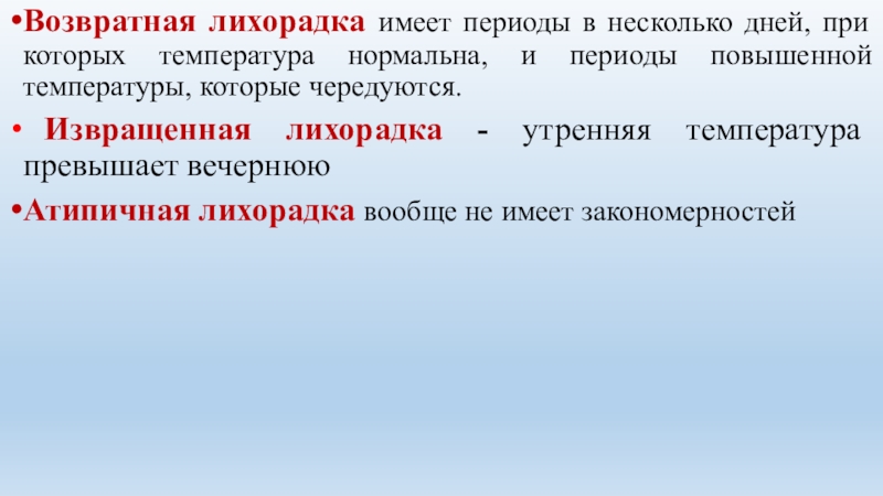Слайд 8Возвратная лихорадка имеет периоды в несколько дней, при которых температура