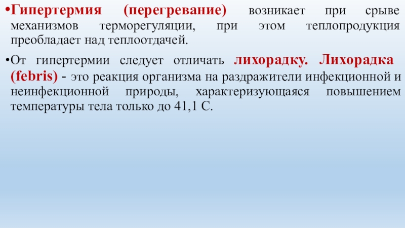 Слайд 4Гипертермия (перегревание) возникает при срыве механизмов терморегуляции, при этом теплопродукция