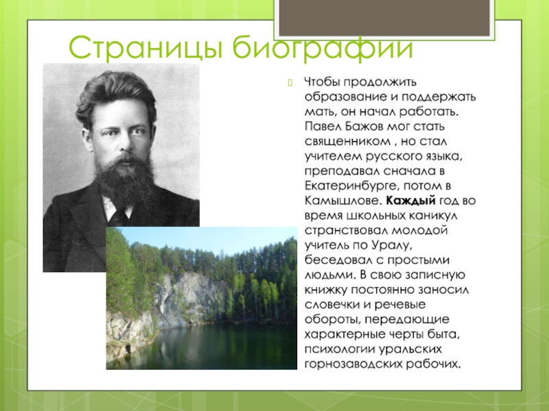 языка, преподавал сначала в Екатеринбурге, потом в Камышлове. Каждый год во время школьных каникул странствовал молодой учитель по Уралу, беседовал с простыми людьми. В свою записную книжку постоянно заносил словечки и речевые обороты, передающие характерные черты быта, психологии уральских горнозаводских рабочих.
