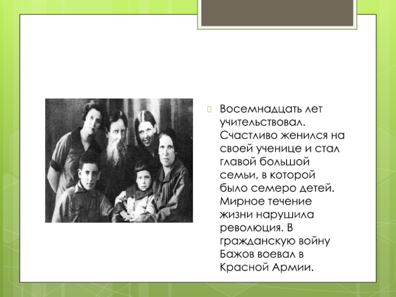 Слайд 5Восемнадцать лет учительствовал. Счастливо женился на своей ученице и стал