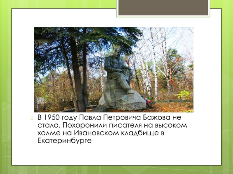 Слайд 7В 1950 году Павла Петровича Бажова не стало. Похоронили писателя