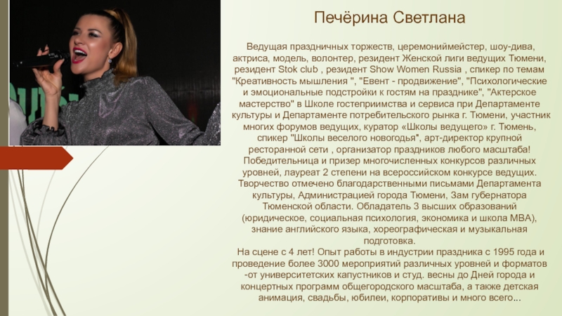 Покоряющая тактом общения, обонянием, харизмой, мощнейшей энергетикой Светлана соблюдает интересы заказчиков и грамотно расставляет акценты вечера.