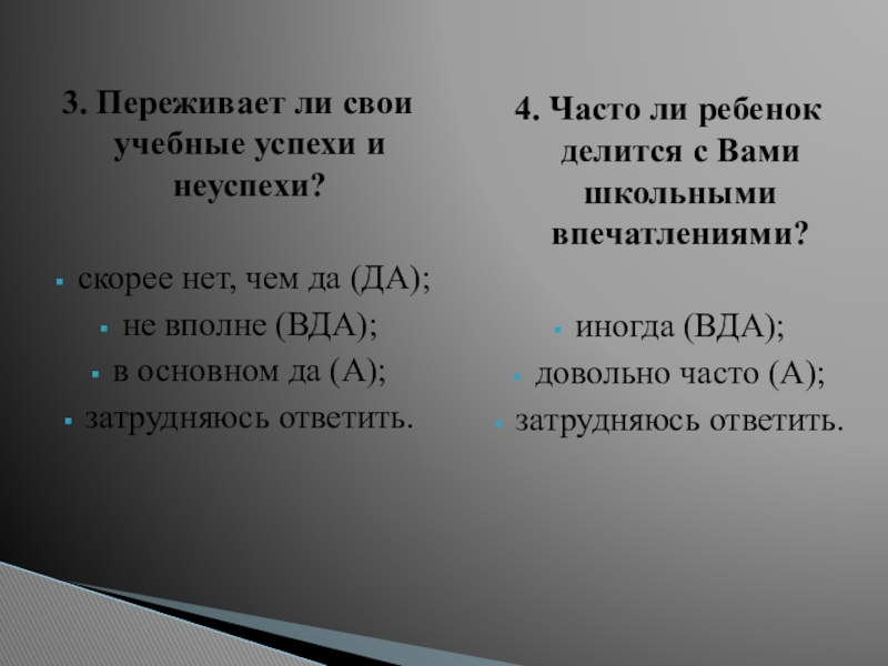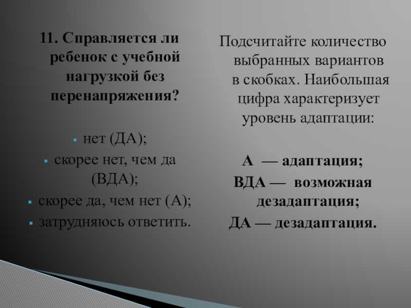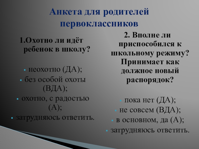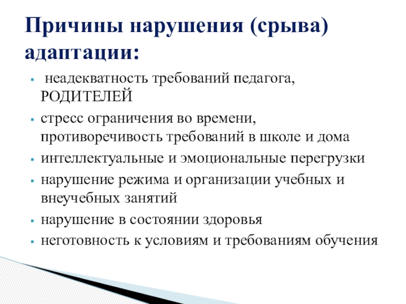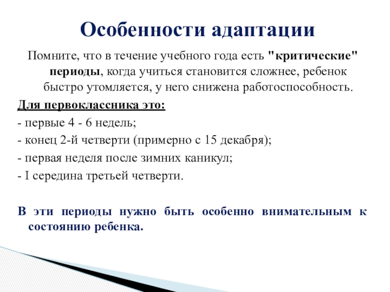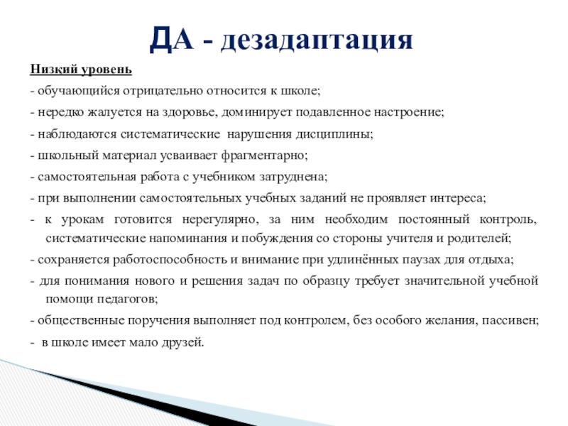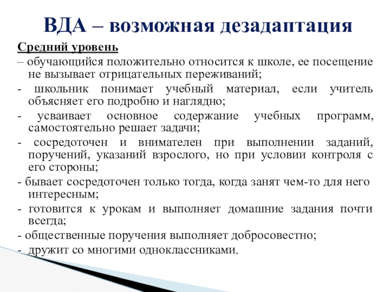 детей имеют более длительный период адаптации: дети могут играть на уроках, выяснять отношения с соседями, не реагируют на замечания учителя или реагируют бурно, трудно осваивают программу.14% детей имеют значительные трудности: программу не осваивают, имеют негативные формы поведения, резко проявляют отрицательные эмоции.