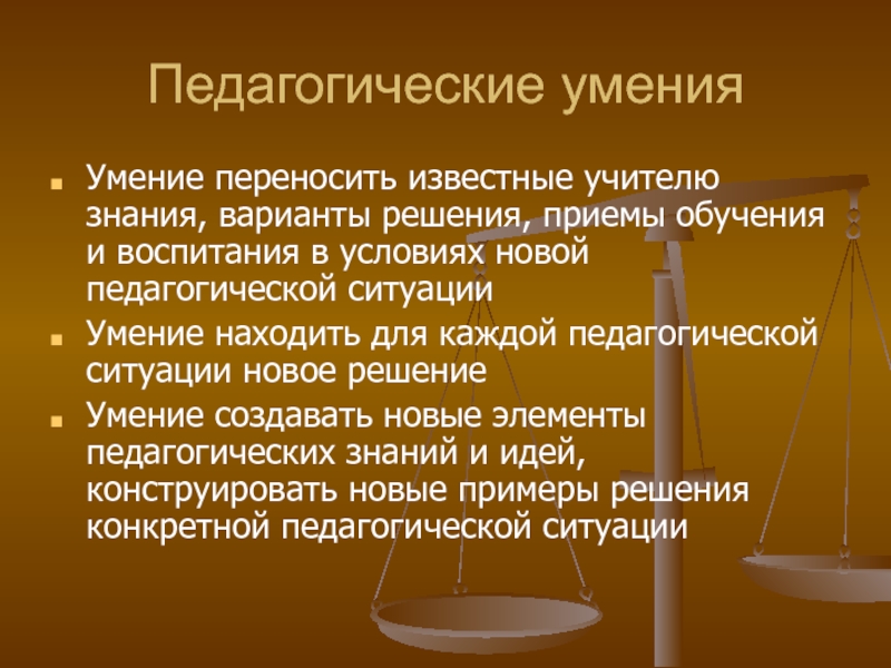 Умение создавать новые элементы педагогических знаний и идей, конструировать новые примеры решения конкретной педагогической ситуации