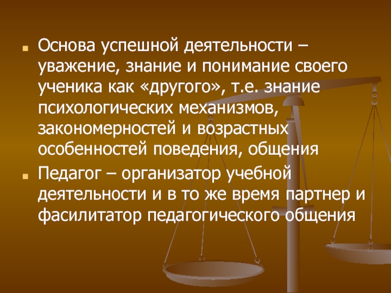 Слайд 3Основа успешной деятельности – уважение, знание и понимание своего ученика
