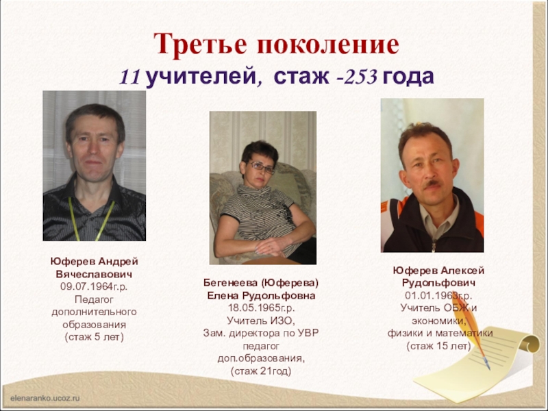 8 педагогов (стаж 276 лет),в третьем поколении – 11 педагогов (стаж 253год),