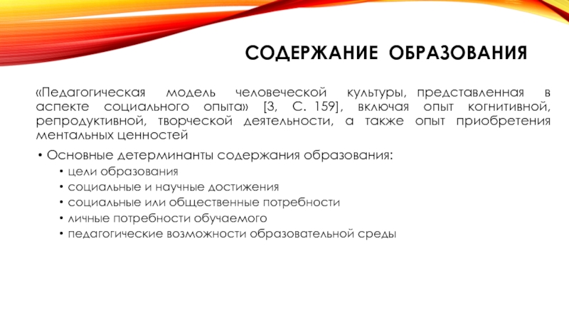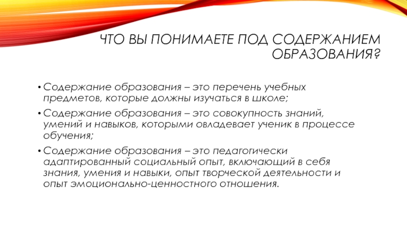 Содержание образования – это педагогически адаптированный социальный опыт, включающий в себя знания, умения и навыки, опыт творческой деятельности и опыт эмоционально-ценностного отношения.