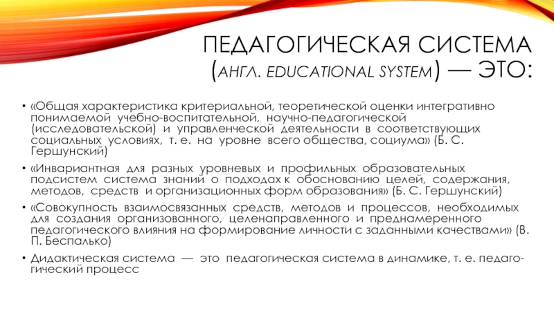 «Инвариантная для разных уровневых и профильных образовательных подсистем система знаний о подходах к обоснованию целей, содержания, методов, средств и организационных форм образования» (Б. С. Гершунский)