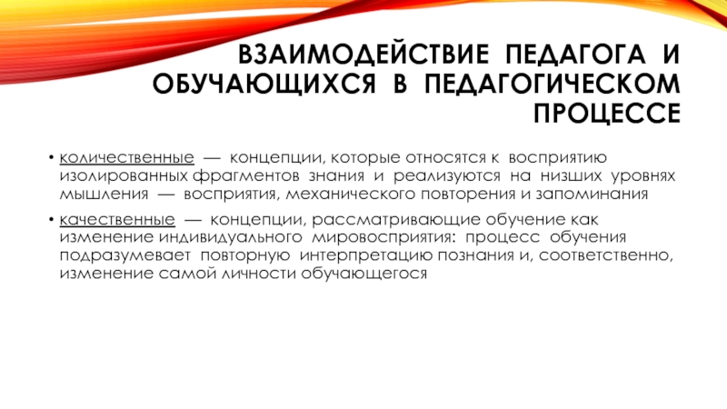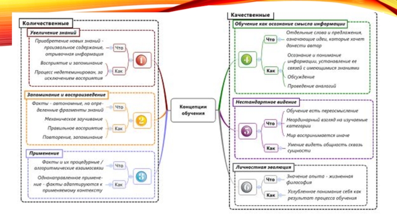 качественные — концепции, рассматривающие обучение как изменение индивидуального мировосприятия: процесс обучения подразумевает повторную интерпретацию познания и, соответственно, изменение самой личности обучающегося