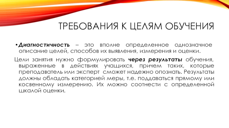 через результаты обучения, выраженные в действиях учащихся, причем таких, которые преподаватель или эксперт сможет надежно опознать. Результаты должны обладать категорией меры, т.е. поддаваться прямому или косвенному измерению. Их можно соотнести с определенной шкалой оценки.