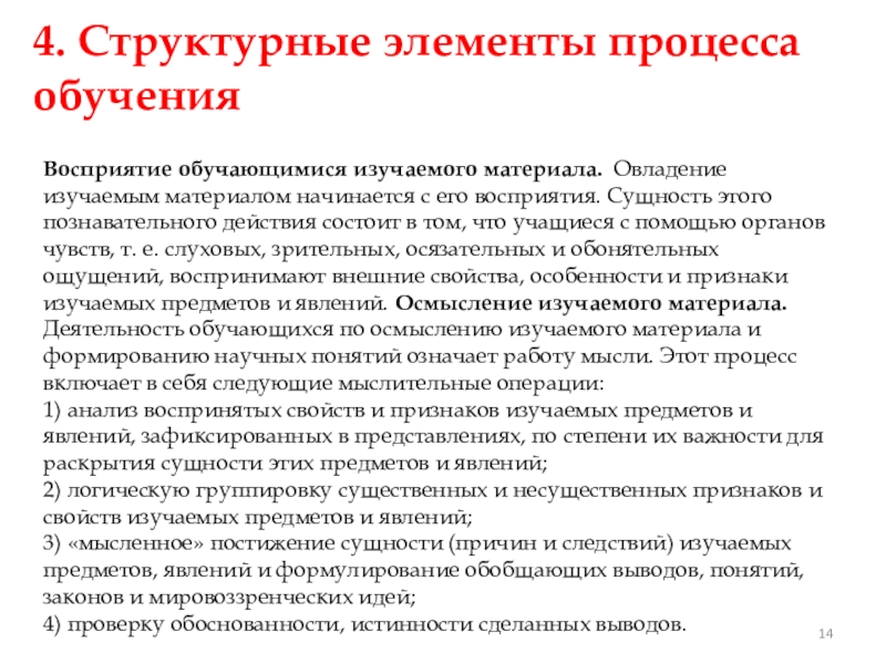 в том, что учащиеся с помощью органов чувств, т. е. слуховых, зрительных, осязательных и обонятельных ощущений, воспринимают внешние свойства, особенности и признаки изучаемых предметов и явлений. Осмысление изучаемого материала. Деятельность обучающихся по осмыслению изучаемого материала и формированию научных понятий означает работу мысли. Этот процесс включает в себя следующие мыслительные операции: