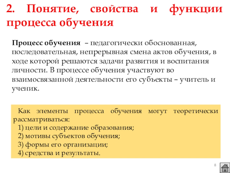 Слайд 8Процесс обучения – педагогически обоснованная, последовательная, непрерывная смена актов обучения,