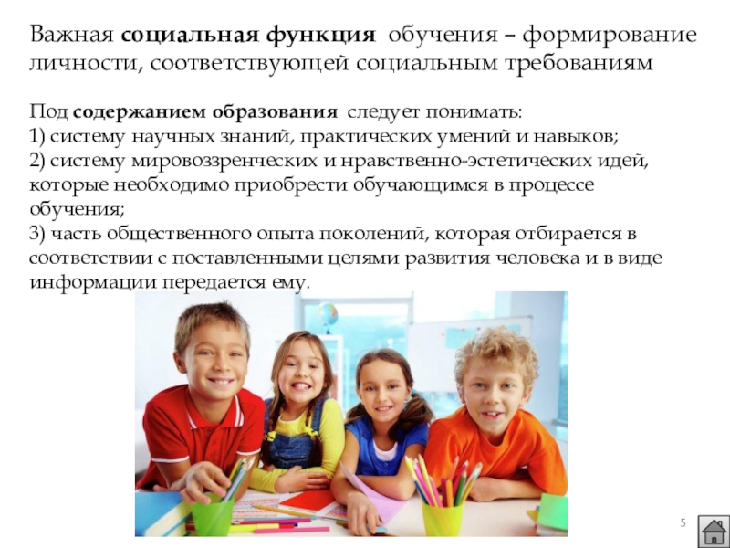 Слайд 5Важная социальная функция обучения – формирование личности, соответствующей социальным требованиям