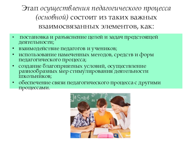 Слайд 17Этап осуществления педагогического процесса (основной) состоит из таких важных взаимосвязанных