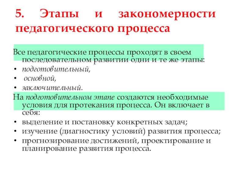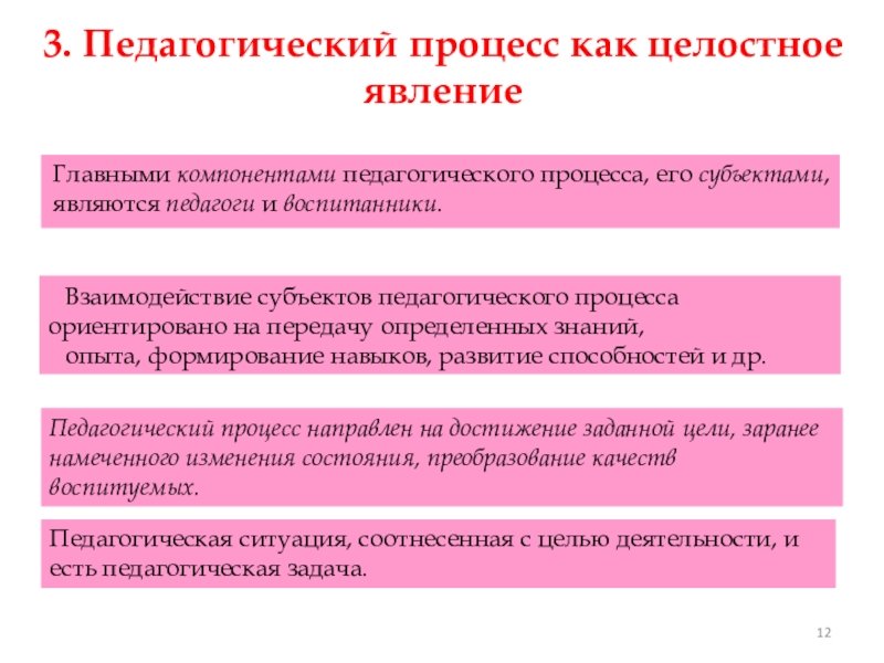 Реализация в единстве всех компонентов содержания образования, а они отражают образовательные, развивающие и воспитательные задачи, при условии целостности деятельности педагога и целостности деятельности воспитанника, и есть сущностная характеристика педагогического процесса как целостного явления.