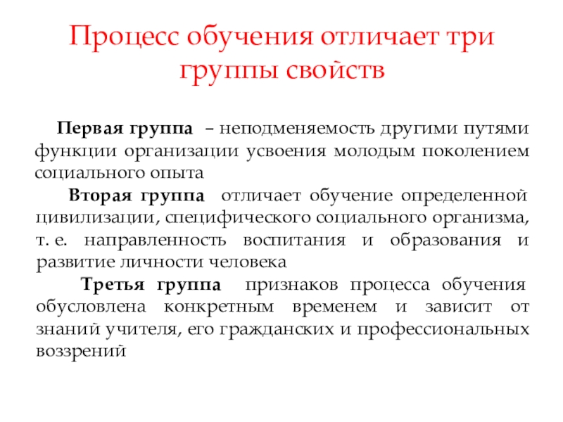 Третья группа признаков процесса обучения обусловлена конкретным временем и зависит от знаний учителя, его гражданских и профессиональных воззрений и воли