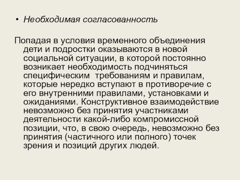 специфическим требованиям и правилам, которые нередко вступают в противоречие с его внутренними правилами, установками и ожиданиями. Конструктивное взаимодействие невозможно без принятия участниками деятельности какой-либо компромиссной позиции, что, в свою очередь, невозможно без принятия (частичного или полного) точек зрения и позиций других людей.