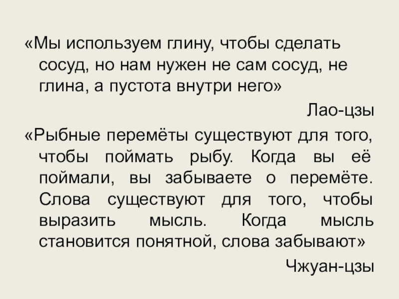 для того, чтобы поймать рыбу. Когда вы её поймали, вы забываете о перемёте. Слова существуют для того, чтобы выразить мысль. Когда мысль становится понятной, слова забывают»