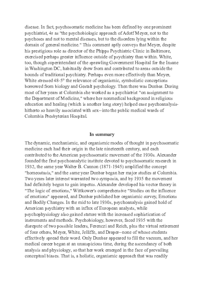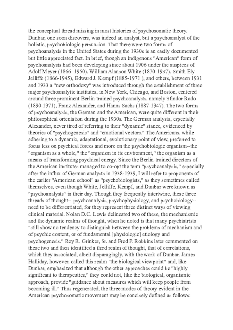 psychoanalyst of the holistic, psychobiologic persuasion. That there were two forms of psychoanalysis in the United States during the 1930s is an easily documented but little appreciated fact. In brief, though an indigenous "American" form of psychoanalysis had been developing since about 1906 under the auspices of Adolf Meyer (1866- 1950), William Alanson White (1870-1937), Smith Ely Jelliffe (1866-1945), Edward J. Kempf (1885-1971 ), and others, between 1931 and 1933 a "new orthodoxy" was introduced through the establishment of three major psychoanalytic institutes, in New York, Chicago, and Boston, centered around three prominent Berlin-trained psychoanalysts, namely Sfindor Rado (1890-1971), Franz Alexander, and Hanns Sachs (1887-1947). The two forms of psychoanalysis, the German and the American, were quite different in their philosophical orientation during the 1930s. The German analysts, especially Alexander, never tired of referring to their "dynamic" stance, evidenced by theories of "psychogenesis" and "emotional vectors." The Americans, while adhering to a dynamic, adaptational, evolutionary point of view, preferred to focus less on psychical forces and more on the psychobiologic organism--the "organism as a whole," the "organism in its environment," the organism as a means of transforming psychical energy. Since the Berlin-trained directors of the American institutes managed to co-opt the term "psychoanalysis," especially after the influx of German analysts in 1938-1939, I will refer to proponents of the earlier "American school" as "psychobiologists," as they sometimes called themselves, even though White, Jelliffe, Kempf, and Dunbar were known as "psychoanalysts" in their day. Though they frequently intertwine, these three threads of thought-- psychoanalysis, psychophysiology, and psychobiology-- need to be differentiated, for they represent three distinct ways of viewing clinical material. Nolan D.C. Lewis delineated two of these, the mechanismie and the dynamic realms of thought, when he noted is that many psychiatrists "still show no tendency to distinguish between the problems of mechanism and of psychic content, or of fundamental [physiologic] etiology and psychogenesis." Roy R. Grinker, Sr. and Fred P. Robbins later commented on these two and then identified a third realm of thought, that of correlations, which they associated, albeit disparagingly, with the work of Dunbar. James Halliday, however, called this realm "the biological viewpoint" and, like Dunbar, emphasized that although the other approaches could be "highly significant to therapeutics," they could not, like the biological, organismic approach, provide "guidance about measures which will keep people from becoming ill." Thus regenerated, the three modes of theory evident in the American psychosomatic movement may be concisely defined as follows: