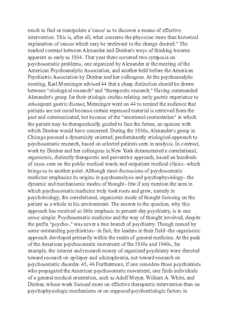 concerns the physician more than historical explanation of causes which may be irrelevant to the change desired." The marked contrast between Alexander and Dunbar's ways of thinking became apparent as early as 1934. That year there occurred two symposia on psychosomatic problems, one organized by Alexander at the meeting of the American Psychoanalytic Association, and another held before the American Psychiatric Association by Dunbar and her colleagues. At the psychoanalytic meeting, Karl Menninger advised 44 that a sharp distinction should be drawn between "etiological research" and "therapeutic research." Having commended Alexander's group for their etiologic studies relating early gastric experience to subsequent gastric disease, Menninger went on 44 to remind the audience that patients are not cured because certain repressed material is retrieved from the past and communicated, but because of the "emotional reorientation" in which the patient may be therapeutically guided to face the future, an opinion with which Dunbar would have concurred. During the 1930s, Alexander's group in Chicago pursued a dynamicity oriented, predominantly etiological approach to psychosomatic research, based on selected patients seen in analysis. In contrast, work by Dunbar and her colleagues in New York demonstrated a correlational, organismic, distinctly therapeutic and preventive approach, based on hundreds of cases seen on the public medical wards and outpatient medical clinics--which brings us to another point. Although most discussions of psychosomatic medicine emphasize its origins in psychoanalysis and psychopbysiology--the dynamic and mechanismic modes of thought--few if any mention the area in which psychosomatic medicine truly took roots and grew, namely in psychobiology, the correlational, organismic mode of thought focusing on the patient as a whole in his environment. The answer to the question, why this approach has received so little emphasis in present-day psychiatry, is in one sense simple: Psychosomatic medicine and the way of thought involved, despite the prefix "psycho-," was never a true branch of psychiatry. Though nursed by some outstanding psychiatrists--in fact, the leaders in their field--the organismic approach developed primarily within the realm of general medicine. At the peak of the American psychosomatic movement of the 1930s and 1940s, for example, the interest and research money of organized psychiatry were directed toward research on epilepsy and schizophrenia, not toward research on psychosomatic disorder. 45, 46 Furthermore, if one considers those psychiatrists who propagated the American psychosomatic movement, one finds individuals of a general medical orientation, such as Adolf Meyer, William A. White, and Dunbar, whose work focused more on effective therapeutic intervention than on psychophysiologic mechanisms or on supposed psychoetiologic factors in