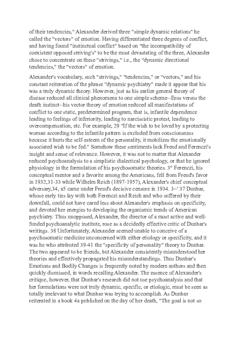 Alexander's vocabulary, such "strivings," "tendencies," or "vectors," and his constant reiteration of the phrase "dynamic psychiatry" made it appear that his was a truly dynamic theory. However, just as his earlier general theory of disease reduced all clinical phenomena to one simple scheme--Eros versus the death instinct--his vector theory of emotion reduced all manifestations of conflict to one static, predetermined program, that is, infantile dependence leading to feelings of inferiority, leading to narcissistic protest, leading to overcompensation, etc. For example, 29 "If the wish to be loved by a protecting woman according to the infantile pattern is excluded from consciousness because it hurts the self-esteem of the personality, it mobilizes the emotionally associated wish to be fed." Somehow these sentiments lack Freud and Ferenczi's insight and sense of relevance. However, it was not to matter that Alexander reduced psychoanalysis to a simplistic dialectical psychology, or that he ignored physiology in the formulation of his psychosomatic theories. 3° Ferenczi, his conceptual mentor and a favorite among the Americans, fell from Freud's favor in 1932,31-33 while Wilhelm Reich (1897-1957), Alexander's chief conceptual adversary,34, a5 came under Freud's decisive censure in 1934. 3~' 37 Dunbar, whose early ties lay with both Ferenczi and Reich and who suffered by their downfall, could not have cared less about Alexander's emphasis on specificity, and devoted her energies to developing the organismic trends of American psychiatry. Thus unopposed, Alexander, the director of a most active and well- funded psychoanalytic institute, rose as a decidedly effective critic of Dunbar's writings. 38 Unfortunately, Alexander seemed unable to conceive of a psychosomatic medicine unconcerned with either etiology or specificity, and it was he who attributed 39-41 the "specificity of personality" theory to Dunbar.
