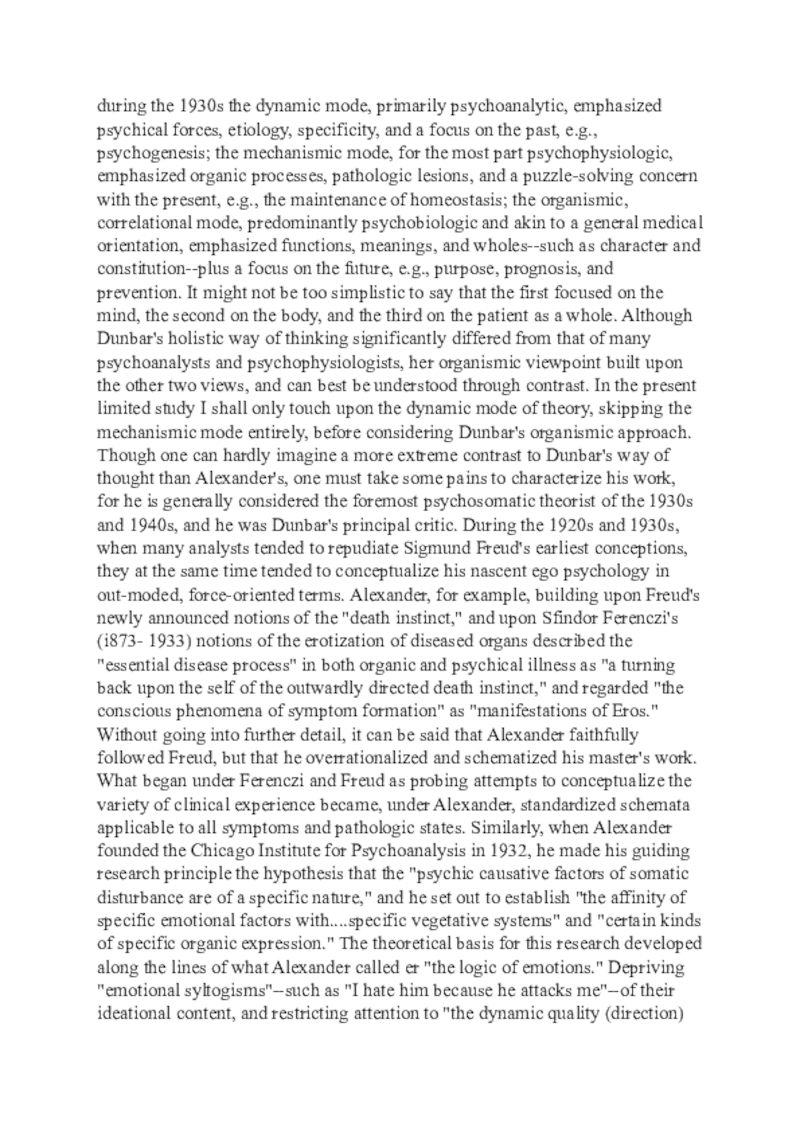 psychogenesis; the mechanismic mode, for the most part psychophysiologic, emphasized organic processes, pathologic lesions, and a puzzle-solving concern with the present, e.g., the maintenance of homeostasis; the organismic, correlational mode, predominantly psychobiologic and akin to a general medical orientation, emphasized functions, meanings, and wholes--such as character and constitution--plus a focus on the future, e.g., purpose, prognosis, and prevention. It might not be too simplistic to say that the first focused on the mind, the second on the body, and the third on the patient as a whole. Although Dunbar's holistic way of thinking significantly differed from that of many psychoanalysts and psychophysiologists, her organismic viewpoint built upon the other two views, and can best be understood through contrast. In the present limited study I shall only touch upon the dynamic mode of theory, skipping the mechanismic mode entirely, before considering Dunbar's organismic approach. Though one can hardly imagine a more extreme contrast to Dunbar's way of thought than Alexander's, one must take some pains to characterize his work, for he is generally considered the foremost psychosomatic theorist of the 1930s and 1940s, and he was Dunbar's principal critic. During the 1920s and 1930s, when many analysts tended to repudiate Sigmund Freud's earliest conceptions, they at the same time tended to conceptualize his nascent ego psychology in