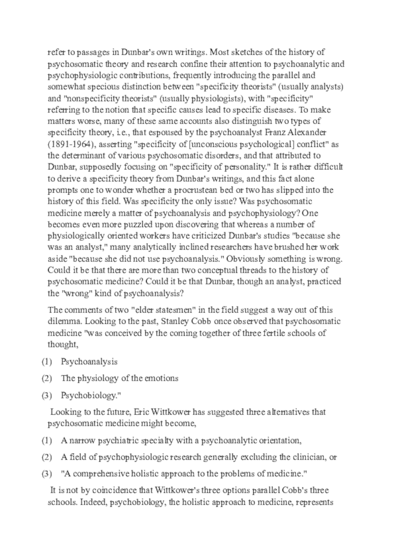 to psychoanalytic and psychophysiologic contributions, frequently introducing the parallel and somewhat specious distinction between "specificity theorists" (usually analysts) and "nonspecificity theorists" (usually physiologists), with "specificity" referring to the notion that specific causes lead to specific diseases. To make matters worse, many of these same accounts also distinguish two types of specificity theory, i.e., that espoused by the psychoanalyst Franz Alexander (1891-1964), asserting "specificity of [unconscious psychological] conflict" as the determinant of various psychosomatic disorders, and that attributed to Dunbar, supposedly focusing on "specificity of personality." It is rather difficult to derive a specificity theory from Dunbar's writings, and this fact alone prompts one to wonder whether a procrustean bed or two has slipped into the history of this field. Was specificity the only issue? Was psychosomatic medicine merely a matter of psychoanalysis and psychophysiology? One becomes even more puzzled upon discovering that whereas a number of physiologically oriented workers have criticized Dunbar's studies "because she was an analyst," many analytically inclined researchers have brushed her work aside "because she did not use psychoanalysis." Obviously something is wrong. Could it be that there are more than two conceptual threads to the history of psychosomatic medicine? Could it be that Dunbar, though an analyst, practiced the "wrong" kind of psychoanalysis?