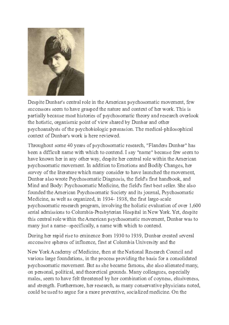 Throughout some 40 years of psychosomatic research, "Flanders Dunbar" has been a difficult name with which to contend. I say "name" because few seem to have known her in any other way, despite her central role within the American psychosomatic movement. In addition to Emotions and Bodily Changes, her survey of the literature which many consider to have launched the movement, Dunbar also wrote Psychosomatic Diagnosis, the field's first handbook, and Mind and Body: Psychosomatic Medicine, the field's first best seller. She also founded the American Psychosomatic Society and its journal, Psychosomatic Medicine, as welt as organized, in 1934- 1938, the first large-scale psychosomatic research program, involving the holistic evaluation of over 1,600 serial admissions to Columbia-Presbyterian Hospital in New York. Yet, despite this central role within the American psychosomatic movement, Dunbar was to many just a name--specifically, a name with which to contend.