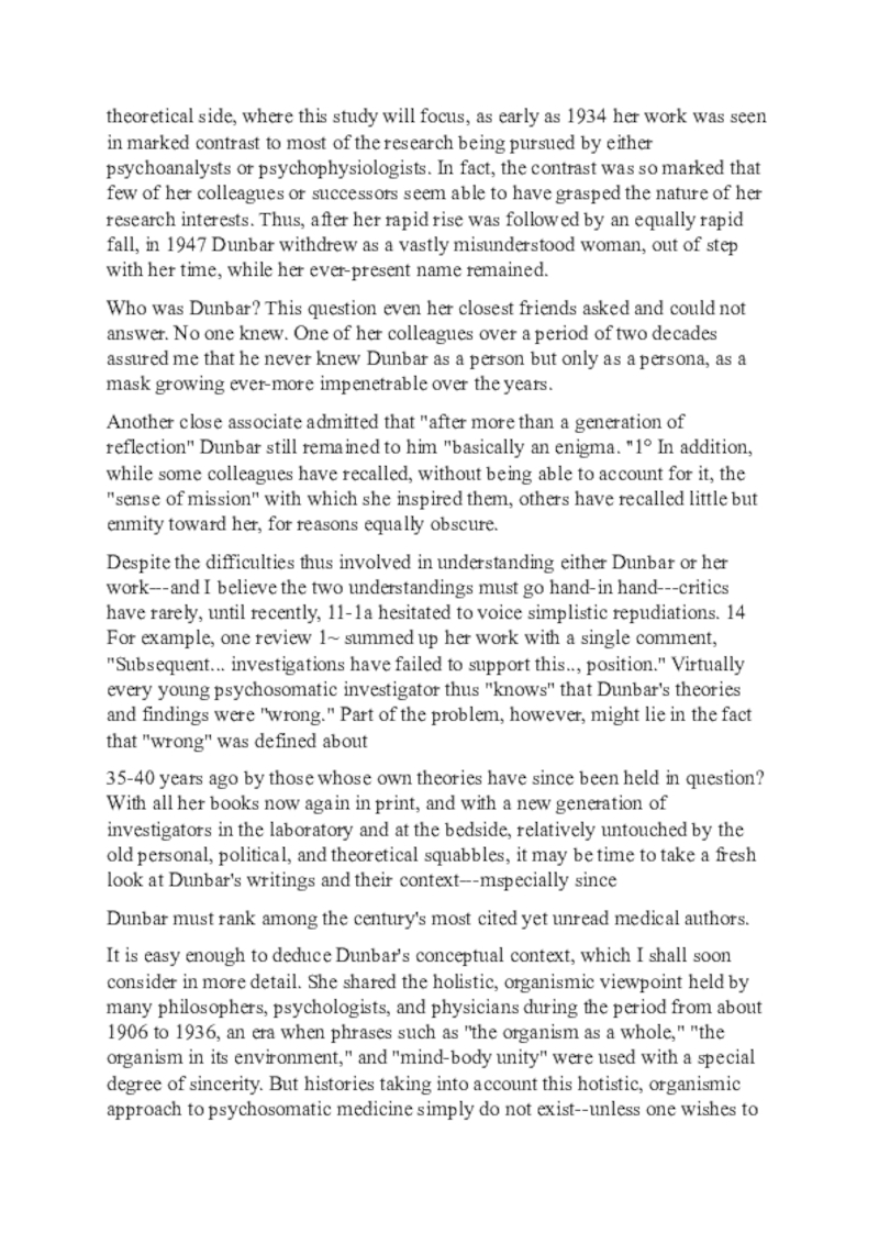 of the research being pursued by either psychoanalysts or psychophysiologists. In fact, the contrast was so marked that few of her colleagues or successors seem able to have grasped the nature of her research interests. Thus, after her rapid rise was followed by an equally rapid fall, in 1947 Dunbar withdrew as a vastly misunderstood woman, out of step with her time, while her ever-present name remained.