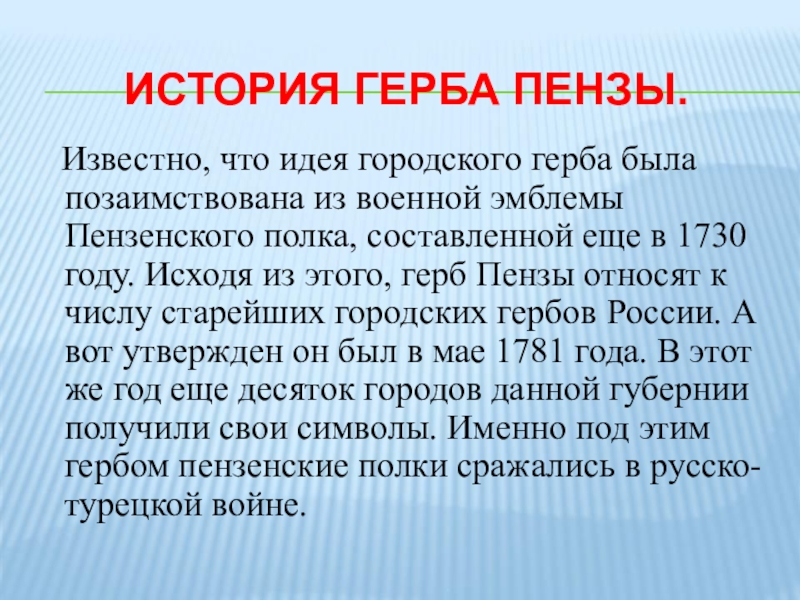 году. Исходя из этого, герб Пензы относят к числу старейших городских гербов России. А вот утвержден он был в мае 1781 года. В этот же год еще десяток городов данной губернии получили свои символы. Именно под этим гербом пензенские полки сражались в русско-турецкой войне.