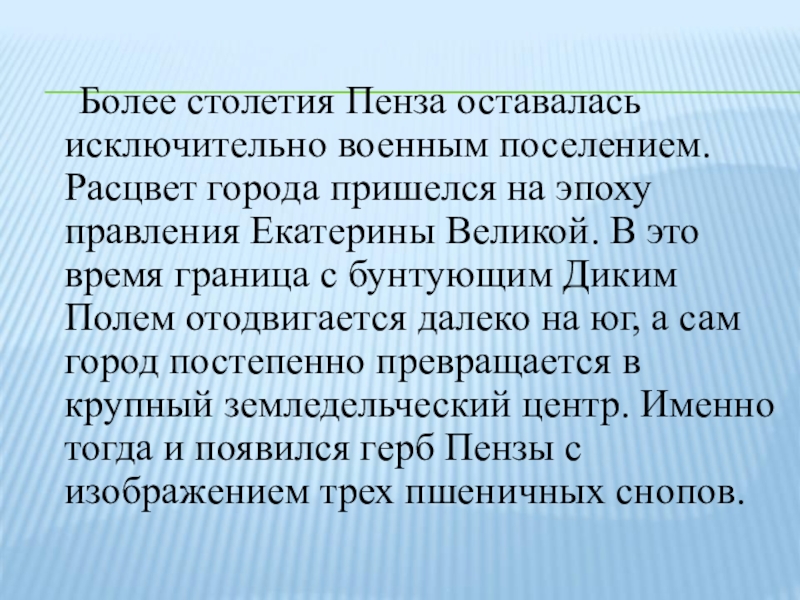 время граница с бунтующим Диким Полем отодвигается далеко на юг, а сам город постепенно превращается в крупный земледельческий центр. Именно тогда и появился герб Пензы с изображением трех пшеничных снопов.