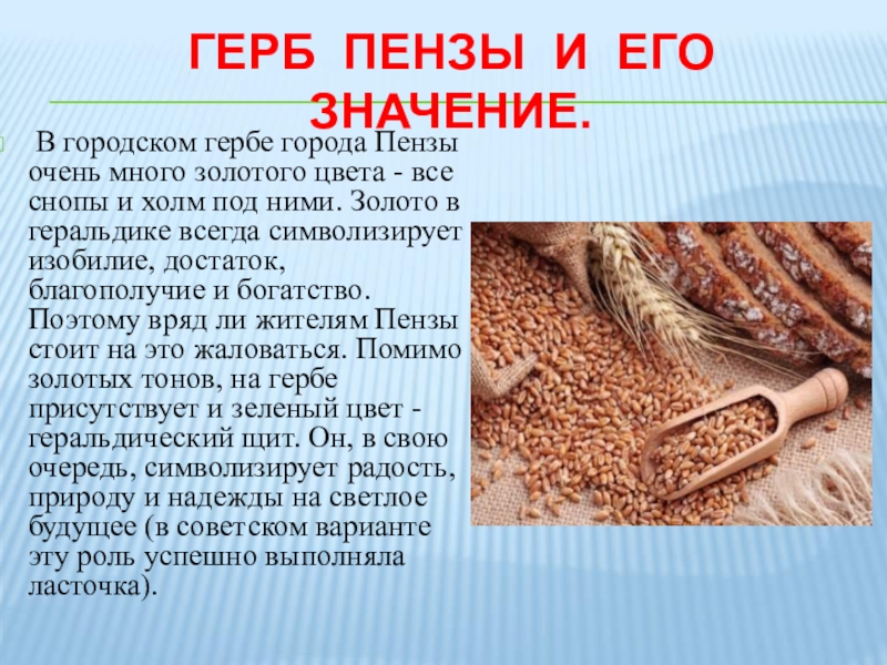 ними. Золото в геральдике всегда символизирует изобилие, достаток, благополучие и богатство. Поэтому вряд ли жителям Пензы стоит на это жаловаться. Помимо золотых тонов, на гербе присутствует и зеленый цвет - геральдический щит. Он, в свою очередь, символизирует радость, природу и надежды на светлое будущее (в советском варианте эту роль успешно выполняла ласточка).