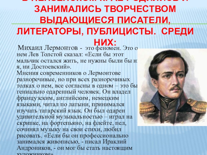 Мнения современников о Лермонтове разноречивые, но при всех разноречивых толках о нем, все согласны в одном – это был гениально одаренный человек. Он владел французским, английским, немецким языками, читал по латыни, принимался изучать татарский язык. Он был одарен удивительной музыкальностью – играл на скрипке, на фортепьяно, на флейте, пел, сочинял музыку на свои стихи, любил рисовать. «Если бы он профессионально занимался живописью, - писал Ираклий Андроников, - он мог бы стать настоящим художником».