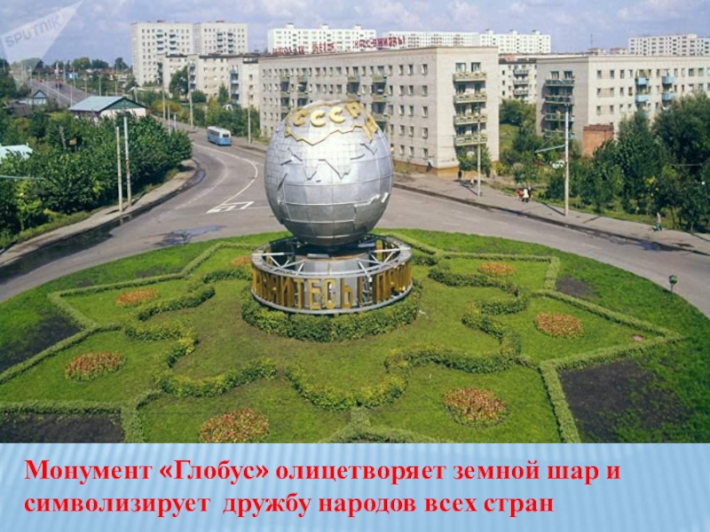 Слайд 14Монумент «Глобус» олицетворяет земной шар и символизирует дружбу народов всех