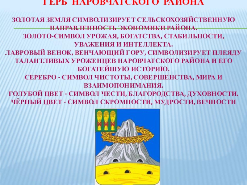 необычен, так как в его основе - традиционный щит зеленого цвета, на котором изображено три снопа. Один из них сложен из пшеничных колосьев, второй составлен из ячменных, а третий - из просяных. Все снопы аккуратно стоят на небольшом холме золотистого окраса.