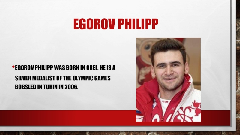 Egorov PhilippEgorov Philipp was born in orel. He is a silver medalist of the Olympic games bobsled