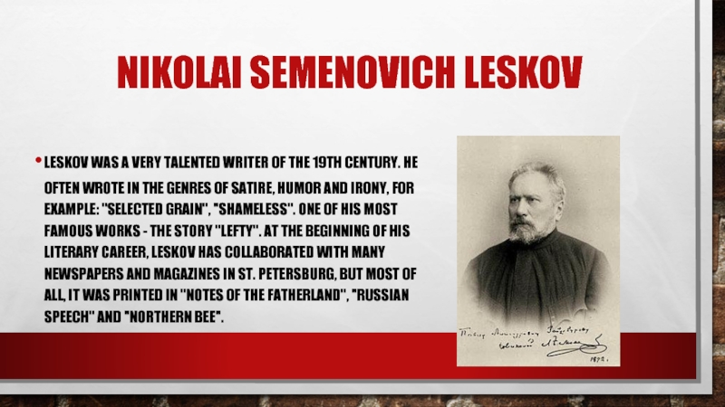 Nikolai Semenovich LeskovLeskov was a very talented writer of the 19th century. He often wrote in the