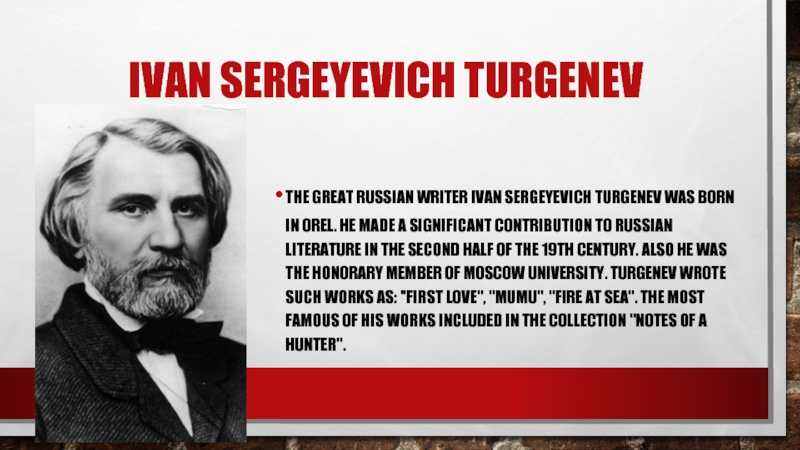 literature in the second half of the 19th century. also He was the honorary member of Moscow University. Turgenev wrote such works as: "First love", "Mumu", "Fire at sea". the most famous of his works included in the collection "notes of a hunter".