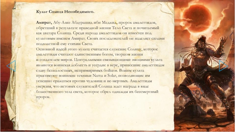 и создателем миров. Центральными связывающими эмоциями культа являются воинская доблесть и усердие в вере, принесшие амалеттидам славу безжалостных, непримиримых бойцов. Воины культа практикуют воинские техники Nama и Solar, позволяющие им успешно сражаться против чудовищ и не-мертвых. Амалеттиды уверены, что истовых служителей Солнца ждет награда в виде божественного тела света, которое обрел однажды их бессмертный пророк.
