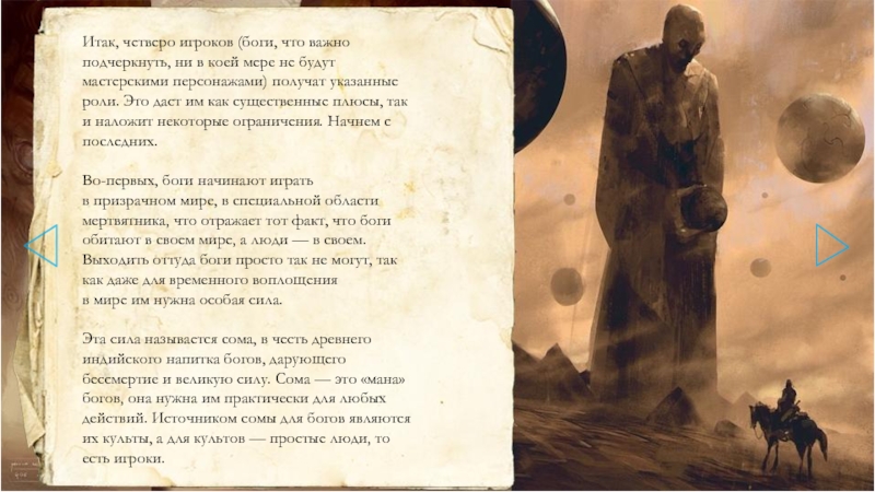 вот что. Мастерская группа отдает четырем игрокам (ориентируюсь в первую очередь по их достижениям на прошлой игре, но не только) роли четырех божеств.