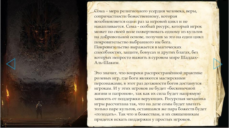 Это значит, что вопреки распространённой практике ролевых игр, где боги являются мастерскими персонажами, в этот раз должности богов достанутся игрокам. И у этих игроков не будет «бесконечной жизни и патронов», так как их сила будет напрямую зависеть от поддержки верующих. Ресурсная механика игры рассчитана так, что на деле сомы будет хватать только паре культов, оставшаяся же пара божеств будет «голодать». Так что и божествам, и их священникам придется искать поддержки у простых игроков.