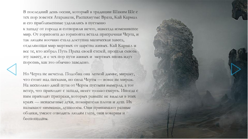 Но Черта не исчезла. Подобна она легкой дымке, миражу, что стоит над песками, но сила Черты — вовсе не мираж. На несколько дней пути от Черты пустыня вымерла, а тот ветер, что приходит с запада, несет только смерть. Иногда с ним приходят призраки, которых раньше не видели в этих краях — ненасытные духи, пожиратели плоти и душ. Их называют «иммана», душесосы. Они принимают разные облики, умеют отводить людям глаза, они коварны и беспощадны.