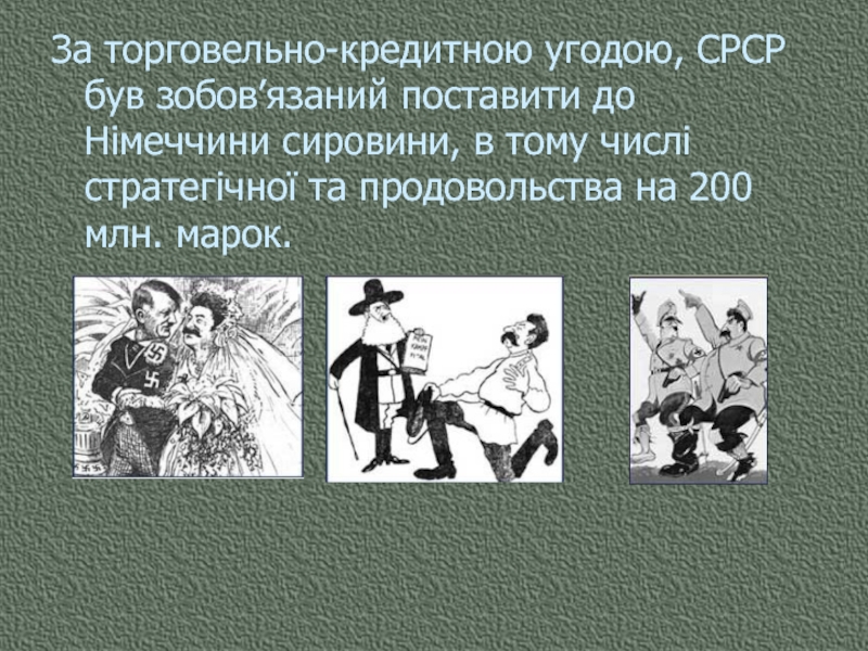 Слайд 24За торговельно-кредитною угодою, СРСР був зобов’язаний поставити до Німеччини сировини,